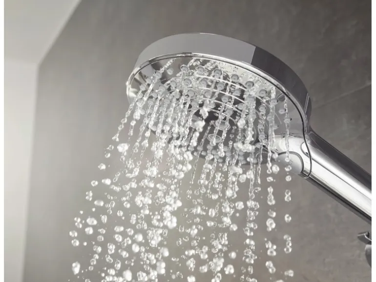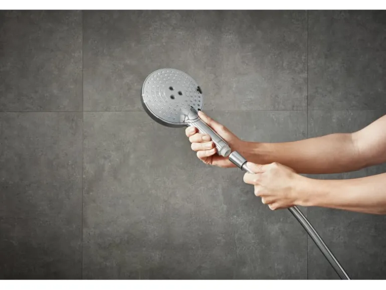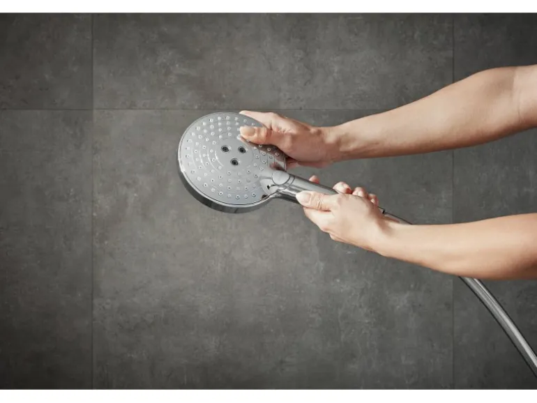 Durch Hansgrohe QuickClean, die Antikalk-Funktion für Duschköpfe und Armaturen entfernen Sie Kalkablagerungen auf den Silikondüsen schnell und einfach per Hand.