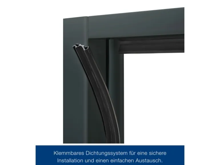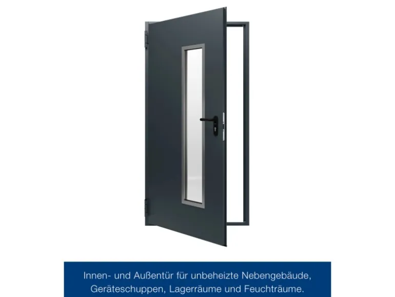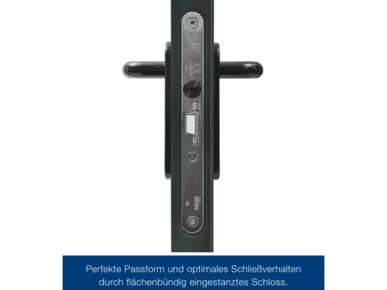 Serienmäßig ist der Verglasungsrahmen aus Alu-Naturton mit Glashalteleisten auf der Schließseite montiert. Optional, z. B. bei nach innen öffnenden Türen, ist der Verglasungsrahmen auch mit Glashalteleisten auf der Öffnungsseite erhältlich.