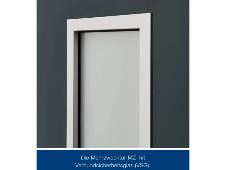 Auf Wunsch ist die Tür auch mit Blockzarge und 3-seitiger EPDM-Dichtung lieferbar. Hörmann bietet Ihnen die Mehrzwecktür MZ auch mit Verglasung, die aus Sicherheitsgründen sehr schmal bzw. gehalten ist. Damit nutzen Sie das Tageslicht für Ihren Innenraum. Sie erhalten serienmäßig VSG mit matter Folie 7 mm, auf Wunsch Drahtglas 7 mm oder Iso-Drahtglas 20 mm mit einer Durchsicht von 230 × 1360 mm.