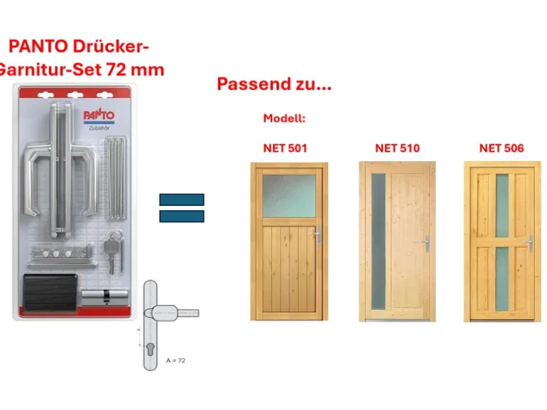 Die Nebeneingangstür NET 501 verfügt über eine 1-fach Verriegelung sowie drei Türbänder, die Sie bei Bedarf zweidimensional verstellen können. Zudem wird eine Aluminium Bodenwinkelschiene in den Maßen 20 mm x 30 mm mitgeliefert.