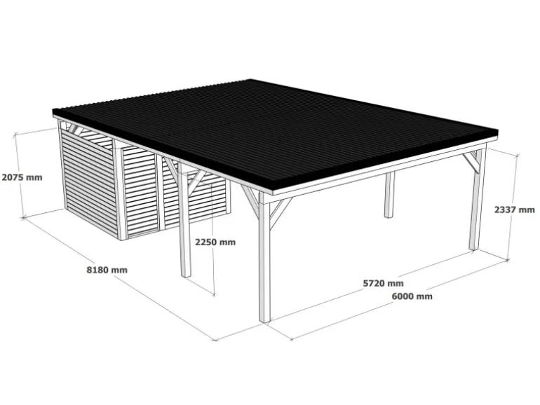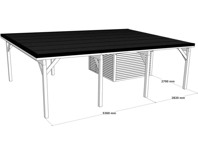 Holzbrüder Carport Ralf 52m² mit kl. Geräteraum wird mit einem kleinen Abstellraum geliefert, in dem Sie Ihr Autozubehör wie Ersatzreifen, Autoteile oder sogar Gartengeräte sicher vor Regen und Schnee aufbewahren können.
