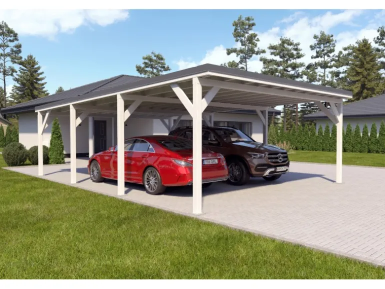 Die Carports von Holzbrüder werden als komplettes Set geliefert. Im Preis ist alles enthalten: hochwertiges nordisches Holz mit Reinweiß-Lackierung, ein dunkelgraues Ruukki-Stahlblechdach, Befestigungsmaterial sowie werkseitig vorgefertigte Bauteile. Sie müssen nichts separat besorgen – einfach bestellen und aufbauen.