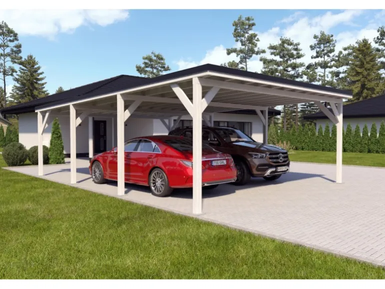 Die Carports von Holzbrüder werden als komplettes Set geliefert. Im Preis ist alles enthalten: hochwertiges in Reinweiß lackiertes nordisches Holz, ein Dach aus Schwarz Ruukki-Stahlblech, Befestigungsmaterial sowie werkseitig vorgefertigte Bauteile. Sie müssen nichts separat besorgen – einfach bestellen und aufbauen.