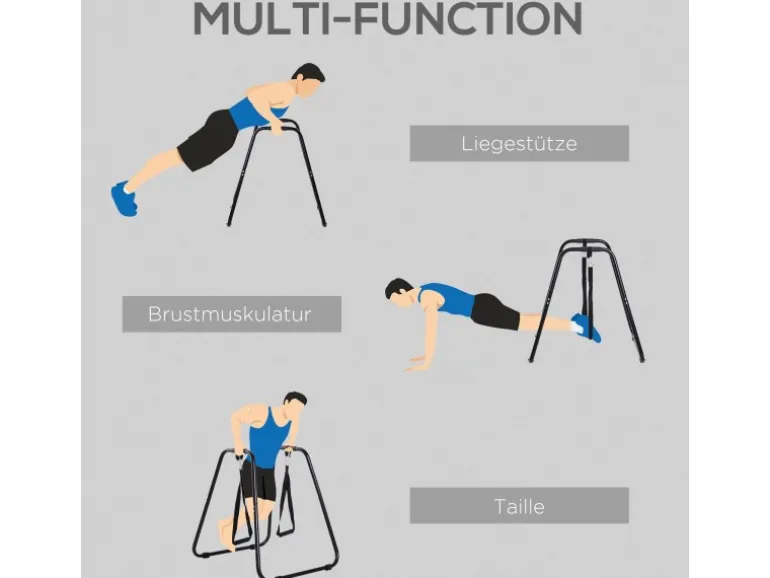 Trainieren mit dem eigenen Körpergewicht liegt voll im Trend. Die Vorteile liegen auf der Hand: Es ist einfach unkomplizierter, als an ein Fitnessstudio mit hunderten von Geräten gebunden zu sein. Ob im Urlaub, auf Geschäftsreise oder kurze 7 Minuten Workouts für Zuhause. Trainieren mit Eigengewicht geht schnell und überall, und führt dabei zu dennoch beachtlichen Ergebnissen. Unsere Dipstation bietet einen kompakten Helfer, mit dem Sie mehr als 50 verschiedene Übungen durchführen können. Die optional zu befestigen Schlaufen machen die Dipstation zum Multifunktionsgerät. Trizeps, Bizeps und Bauchmuskulatur lassen sich einfach durch entsprechende Dips, Liegestütze und Halteübungen stärken. Das regelmäßige Training an der Dipstation stärkt Kraft, Koordination, Gleichgewicht und Haltung. Und das alles flexibel von Zuhause.