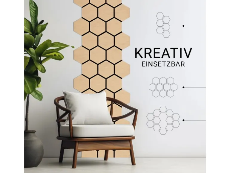8 Akustikpaneele je 76×62 cm (9 Elemente pro Platte) in moderner Hexagonform im Natur Ton