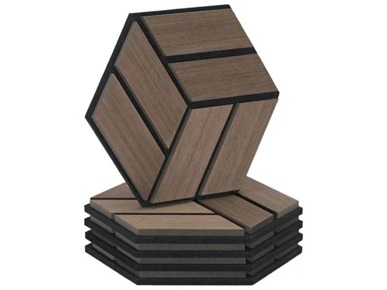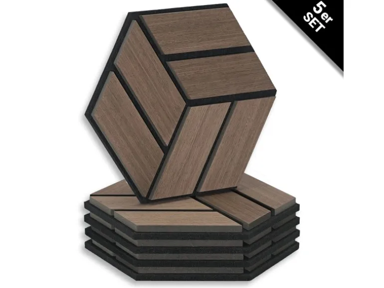 5 Akustikpaneele je 30x26x2 cm in moderner Hexagonform im Walnuss Ton