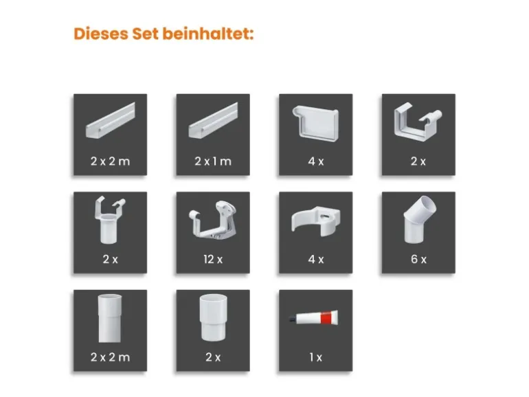 – Alle notwendigen Einzelteile für eine fachgerechte Dachentwässerung in einem Set