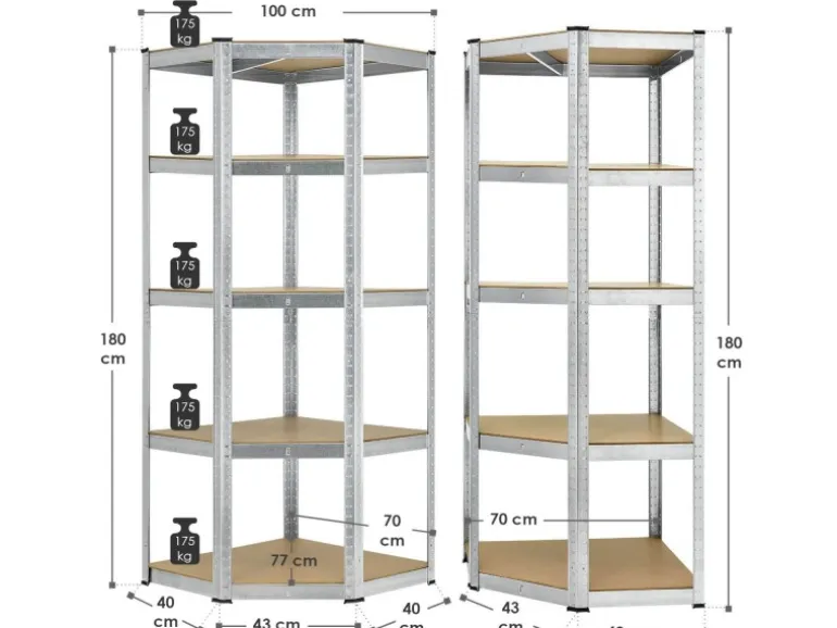 Das Schwerlastregal besitzt 5 Fachböden. Die fünfeckigen Böden überzeugen durch reichlich Stauraum, um Gartenzubehör, Werkzeug, Vorräten, Kisten oder Aktenordner aufgeräumt und schnell griffbereit zu lagern.