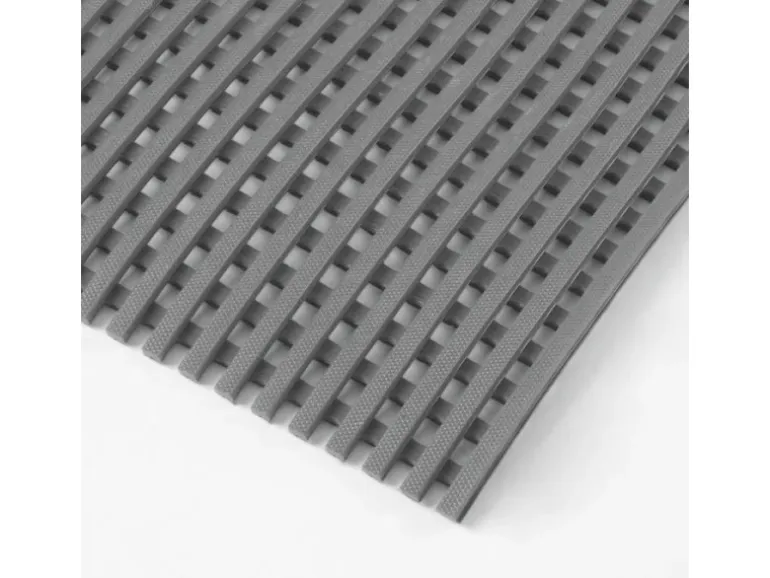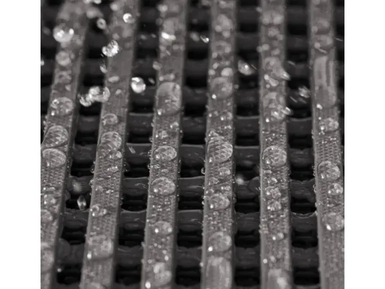 Die maßgefertigte Antirutschmatte Adria erfüllt diese Anforderungen bestens. Die Oberfläche aus elastischen PVC-Riemen bietet neben hervorragendem Halt gute Dämpfungseigenschaften bei Bewegungen und bewirkt bei der Arbeit eine merkliche Entlastung des Körpers. Die netzartige Oberfläche hat zudem noch einen weiteren Vorteil: Sie ist verantwortlich für die ausgezeichnete Drainage-Wirkung und lässt Flüssigkeiten schnell und zuverlässig von dem Bodenrost abfließen. Der Kunststoff-Gitterrost überzeugt insgesamt durch Vielfältigkeit und Robustheit. Die Antirutschmatte zeigt sich nicht nur resistent gegen Chemikalien und Öle, sondern ist darüber hinaus schwer entflammbar und weist eine antibakterielle Beschaffenheit auf.