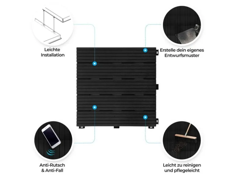 Mit unseren Klickfliesen lassen sich Gärten, Terrassen sowie Balkone kinderleicht und geschmackvoll gestalten, ohne dass beim Verlegen der einzelnen Klick-Dielen viel Zeit investiert werden muss. Das beliebte Klicksystem macht es möglich – einfach die Dielen aneinanderstecken und im Handumdrehen verwandeln Sie Ihre Terrasse oder Ihren Balkon in einen wunderschönen Außenbereich zum Wohlfühlen.