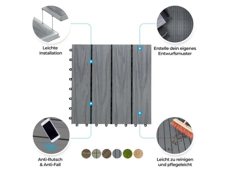 Die WPC Fliesen bedürfen einer sorgsamen Behandlung. Verwenden Sie bitte keine chemischen Reinigungsmittel und keinen Hochdruckreiniger.