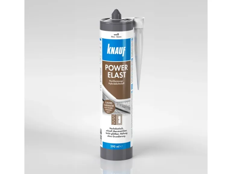 Der Knauf Power Elast ist ein neutral vernetzender, gebrauchsfertiger, einkomponentiger Hybriddichtstoff. Er kombiniert die Hochleistungseigenschaften von Montagekleber und Dichtmasse in einem Produkt.