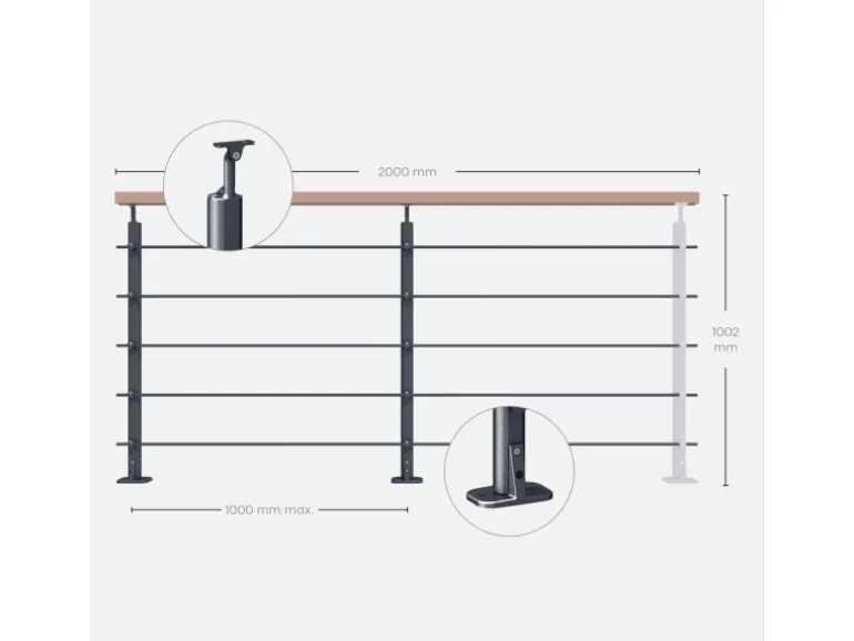 Mit diesem Set können 2 laufende Meter Geländer installiert werden. Es ist möglich, mehrere Bausätze miteinander zu montieren. Um Ihr Werk fertig zu gestalten, ist zusätzlich ein weiterer Abschlusspfosten erforderlich (einzeln erhältlich).