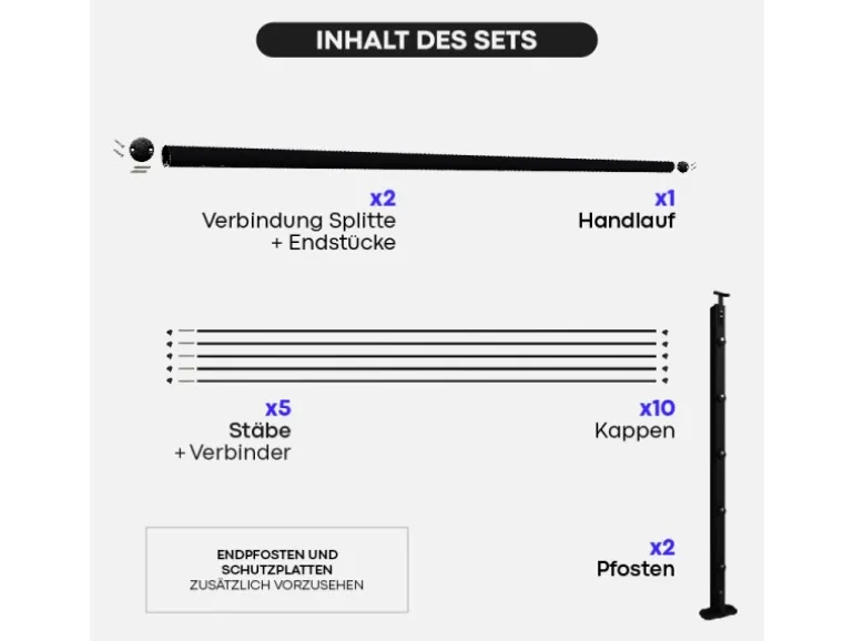 Es besteht aus einem 2m Handlauf, 5 2m Füllstäben, 2 Pfosten und dem entsprechenden Zubehör.
