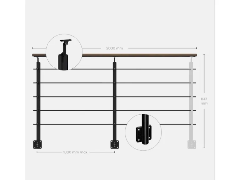 Mit diesem Set können 2 laufende Meter Geländer installiert werden. Es ist möglich, mehrere Bausätze miteinander zu montieren. Um Ihr Werk fertig zu gestalten, ist zusätzlich ein weiterer Abschlusspfosten erforderlich (einzeln erhältlich).