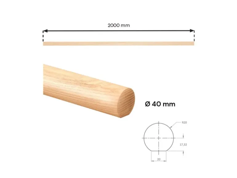 Handlauf aus Holz (europäische Buche, Fichte oder Esche nach Wahl)2 m lang, Wandbefestigung.
