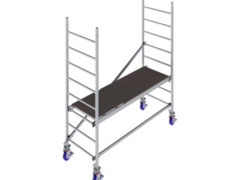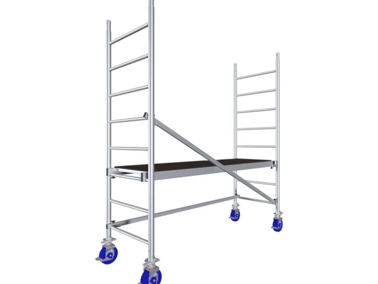 Dank einer einfachen Konstruktion mit wenigen Einzelteilen und form- sowie kraftschlüssigen Klemmverbindungen lässt sich das fahrbare Gerüst schnell und ohne Werkzeug auf- und abbauen. Zwei 1 m Vertikalrahmen, die zu einem 2 m Rahmen zusammengesteckt werden können, sind im Lieferumfang enthalten.