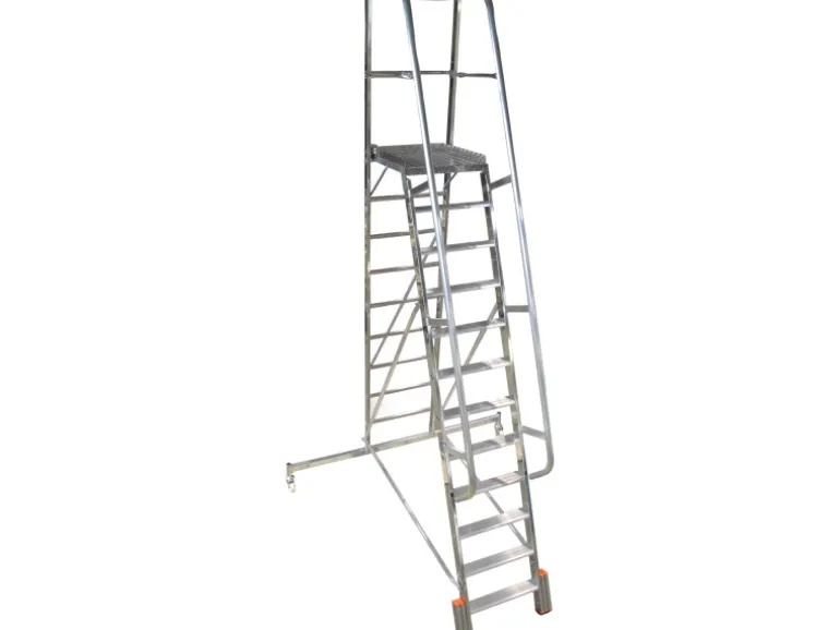 Die 8 cm tiefen, profilierten Stufen ermöglichen einen sicheren und komfortablen Aufstieg. Für zusätzliche Sicherheit sorgen ein beidseitiger Handlauf sowie ein dreiseitiges Plattformgeländer. Zwei integrierte Rollen ermöglichen ein einfaches und sicheres Verfahren der Leiter.