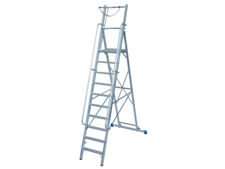 Die großzügige Standplattform misst 50 cm x 45 cm und bietet ausreichend Platz für bequemes Arbeiten. Beidseitig angebrachte Handläufe garantieren einen sicheren Auf- und Abstieg. Eine stabile Quertraverse mit integrierten Fahrrollen ermöglicht sowohl einen sicheren Stand als auch einen einfachen Transport der Leiter.