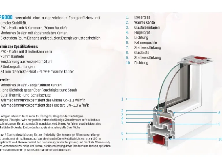 PVC – Profile mit 6 Kammern mit 1,3 mm Stahlarmierung