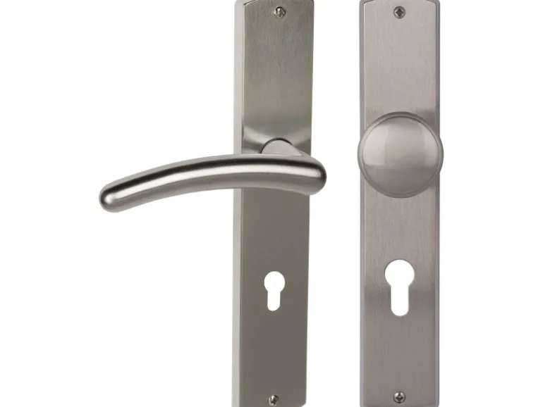 Langschildgarnitur „Isabella-LS“ in Edelstahlfärbig Poliert-Satiniert für Wohnungseingangstüren. Die Garnitur verfügt über eine Rückholfeder und garantiert somit einen dauerhaft waagrechten Sitz des Drückers. Die Garnitur ist mit einer 72 mm Profilzylinder Lochung versehen und passend für alle gängigen Türen mit einer Türstärke von 37 – 42 mm.
