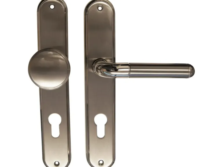Langschildgarnitur „Sabine-LS“ in Chrom-Edelstahlfärbig für Wohnungseingangstüren. Die Garnitur verfügt über eine Rückholfeder und garantiert somit einen dauerhaft waagrechten Sitz des Drückers. Die Garnitur ist mit einer 72 mm Profilzylinder Lochung versehen und passend für alle gängigen Türen mit einer Türstärke von 37 – 42 mm.
