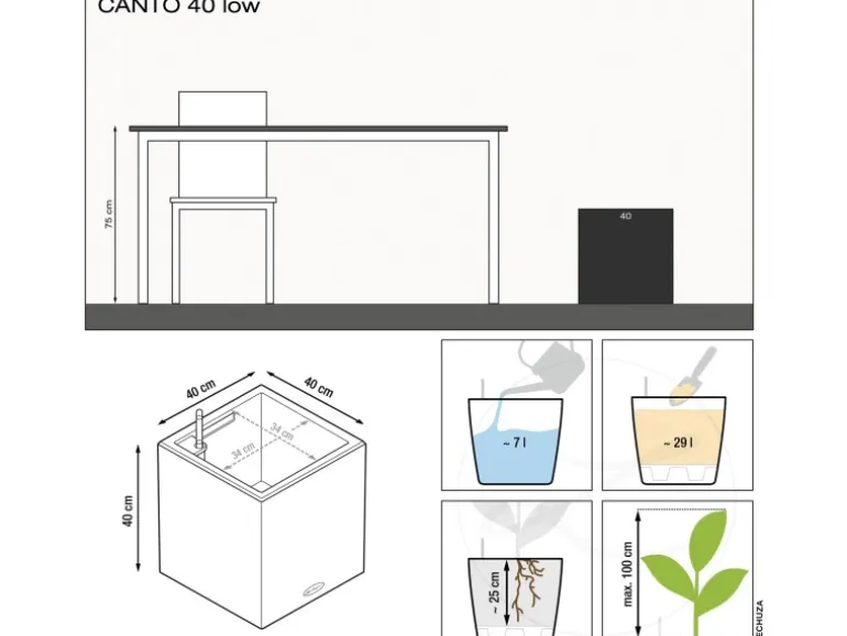 Einsatz und VerwendungDer Pflanzwürfel Canto Stone low kann sowohl im Innenbereich, als auch im Außenbereich verwendet werden. An der Gefäßunterseite befindet sich eine Bodenschraube, welche überschüssiges Regenwasser abfließen lässt. Für die Verwendung im Außenbereich muss diese Schraube herausgedreht werden. Für den Innenbereich muss die Schraube fest angezogen werden. Um den Pflanzen ideale Bedingungen zu schaffen, wird die Verwendung spezieller Pflanzsubstrate empfohlen. Für den Anbau von Obst und Gemüse eignet sich Veggiepon am besten, für Sträucher oder Blumen bietet Terrapon die beste Basis. Zimmerpflanzen haben mit Lechuza®-Pon die idealen Wachstumsbedingungen. Zur Vorbeugung von Staunässe empfiehlt sich Lechuza®-Pon als Drainageschicht (bereits im Lieferumfang enthalten).