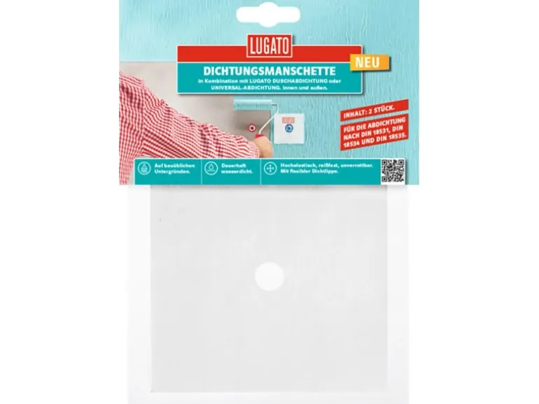 Die mehrlagige Manschette ist für Rohre mit einem Rohrdurchmesser von 15 mm – 32 mm ausgelegt. Zudem ist die Manschette wasserdicht, reißfest, hochelastisch und frostbeständig. In Kombination mit der Lugato Duschabdichtung oder der Universalabdichtung sorgt die Dichtmanschette für eine dauerhafte und wasserdurchlässige Abdichtung.
