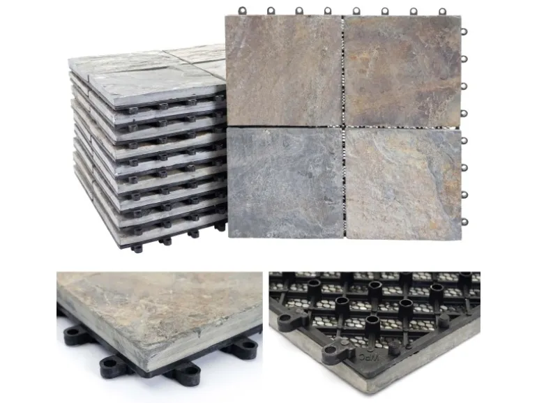 Mit diesen Naturstein-Fliesen verleihen Sie Ihrem Balkon oder der Terrasse eine ganz besondere Atmosphäre und können die Outdoor-Saison richtig genießen. Dabei verlegen Sie die Fliesen schnell und einfach schwimmend. Aus optischen Gründen können Sie noch mit Sand oder ähnlichem weichen Material verfugen. Diese Fliesen sind für selbstverständlich für Personen – nicht aber für Carports o.ä. geeignet.