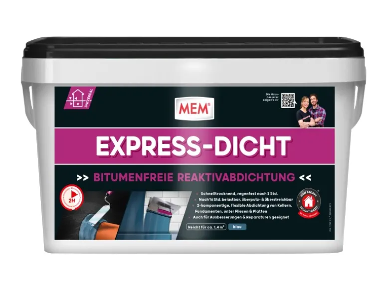 Das MEM Express-Dicht ist eine spachtelfähige und leicht zu verarbeitende, alternative Dickbeschichtung auf der Basis einer Dispersion und einer darauf abgestimmten, hydraulisch abbindenden Pulverkomponente. Im durchgetrockneten Zustand ist es flexibel, rissüberbrückend, wasserundurchlässig und beständig gegen die im Erdreich vorkommenden, aggressiven Belastungen. Darüber hinaus ist das Material durch die Reaktion der beiden Komponenten schnelltrocknend und bereits nach ca. 2 Stunden regenfest sowie nach ca. 16 Stunden vollständig belastbar.