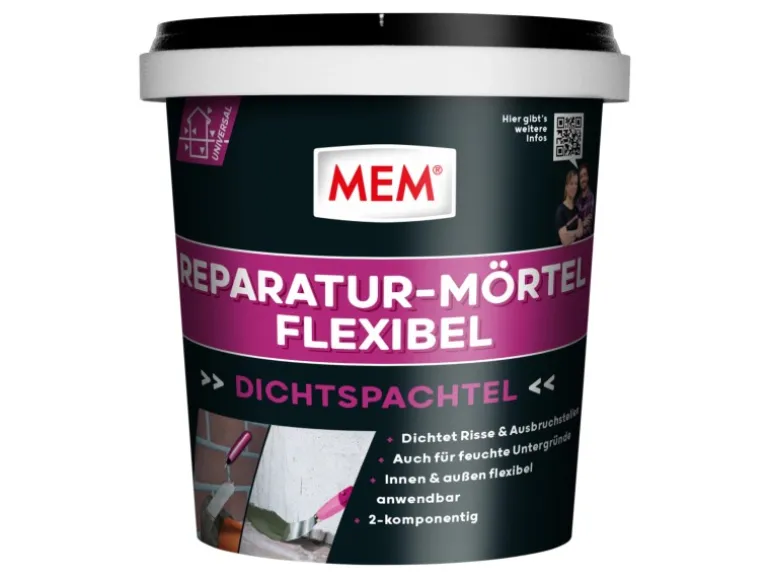 Der MEM Reparatur-Mörtel flexibel besteht aus einer flüssigen Kunstharzdispersion und einem faserverstärkten, kunstharzvergüteten Pulverzement. Nach vollständiger Aushärtung ist der Spezialmörtel absolut frostbeständig.