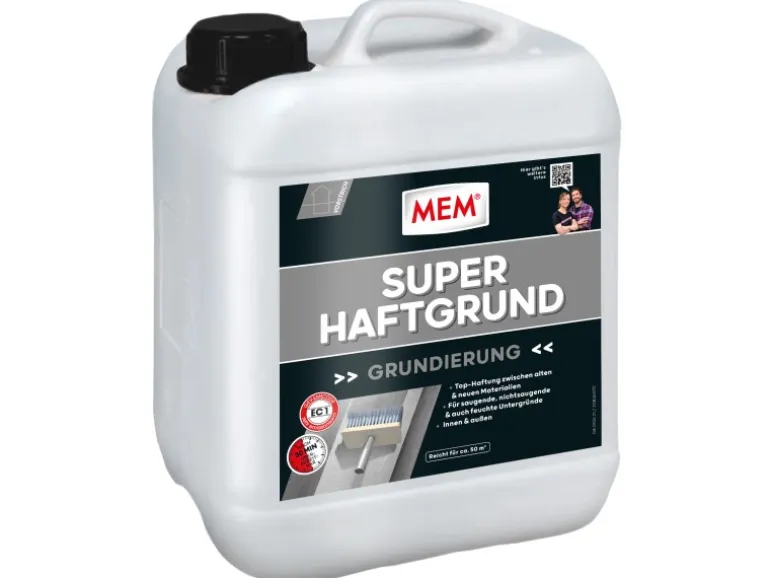 Der MEM Super-Haftgrund ist ein hochwertiger Primer auf Dispersionsbasis. Er sorgt für einen gleichmäßig saugenden Untergrund und bindet gleichzeitig den Staub. Darüber hinaus bildet er einen Film, welcher effektiv als Haftvermittler wirkt.