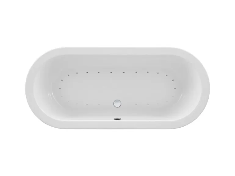 Der Whirlpool ist komplett installiert und anschlussfertig. Das System beinhaltet 24 flache Airdüsen im Wannenbodenbereich, die durch ein besonders geräuscharmes Gebläse betrieben werden. Zuschaltbar ist ein Ozonator, der mittels UV-Licht das System desinfiziert.