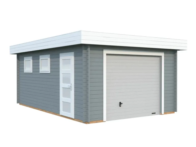 Die starken Pfetten aus Leimholz sorgen für hohe Stabilität und Standfestigkeit der Garage. Das Sektionaltor aus 40 mm starken Stahlsegmenten mit FCWK-freier PU-Schaumfüllung hat die Farbe RAL 9016. Die Garage hat zwei kleine Fenster, die zur Belüftung nach Außen geöffnet werden können. Zudem existiert eine stabile verglaste Einzeltür mit Leimholzrahmen und Zylinderschloss.