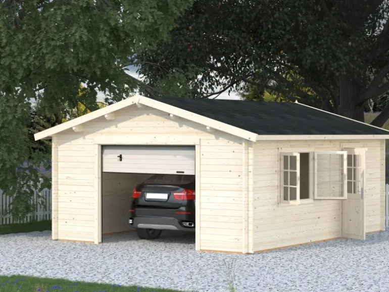 Dank exakt gefertigter Blockbohlen erfolgt der Aufbau innerhalb kürzester Zeit. Der Verwendungzweck ist vielfältig als Garage, Werkstatt oder Lagerraum. Die Dachpappe, SBS-Dacheindeckung, Regenrinnen, Anbauschuppen, Schleppdach sowie eine Innenwand können zusätzlich bestellt werden. Ab Werk wird das Haus mit einer farbigen Fassade im Grundfarbton hellgrau RAL7042 sowie der Akzentfarbe weiß RAL9016 versehen. Das Innere des Hauses bleibt naturbelassen.