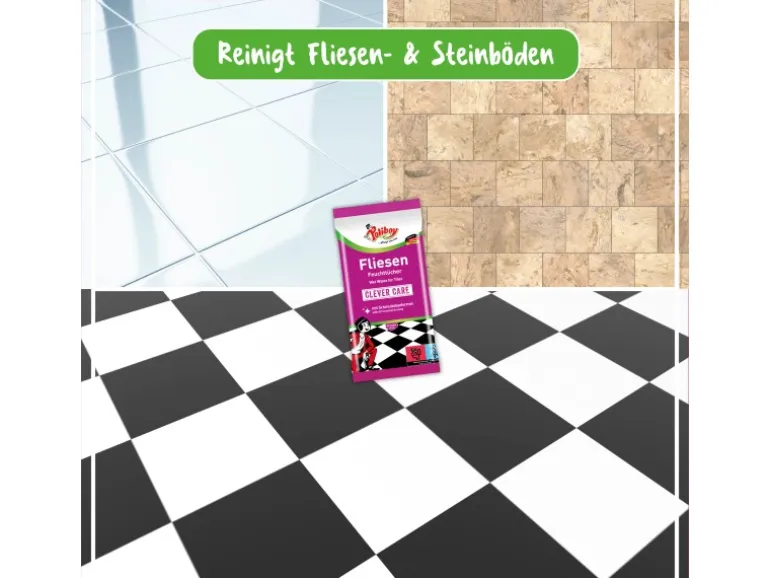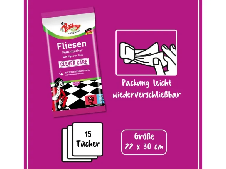 Die Poliboy Fliesen Feuchttücher eignen sich für die Reinigung von Fliesen- und Steinflächen, z.B. in Küche, Flur und Bad. Sie sind ideal für die schnelle Reinigung zwischendurch. Neben Böden können auch Wandfliesen oder Treppen schnell und bequem – ohne lästigen Wischeimer – gereinigt werden. Ein Nachwischen bzw. Trockenreiben ist nicht notwendig. Durch die spezielle Wellenstruktur und die kraftvolle Reinigungslotion nehmen die Tücher den Schmutz sehr gut auf. Zudem bilden neu entwickelte Wirkstoffe bei jedem Wischen einen unsichtbaren Schutz auf der Oberfläche, der bei regelmäßiger Anwendung für ein leichteres Reinigen sorgt – Flecken lösen sich spürbar einfacher. Wertvolle Parfümöle geben dem Raum gleichzeitig einen angenehm frischen Duft. Saubere Ergebnisse mit den Clever Care Feuchttüchern von Poliboy!
