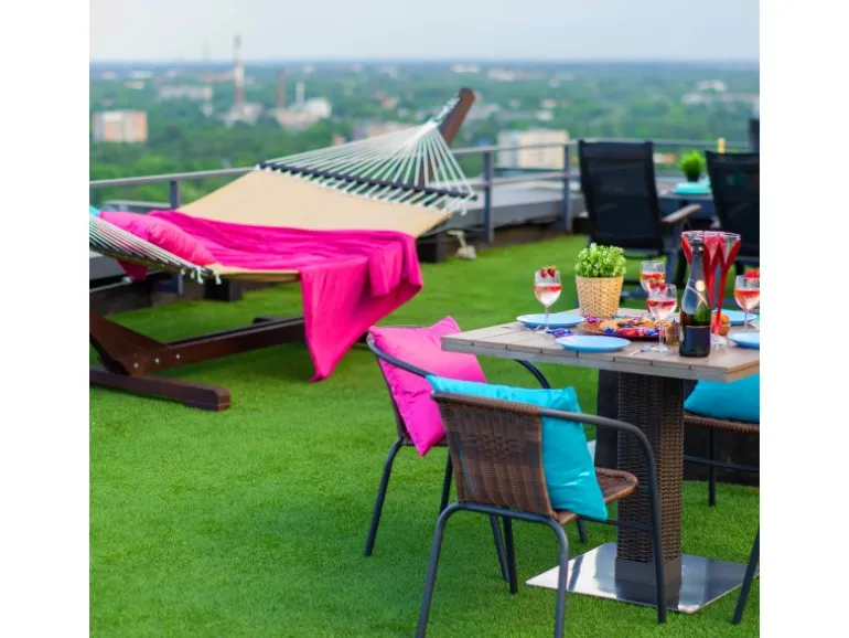 Der Kunstrasen MILO überzeugt mit einem ausgezeichneten Preis-Leistungsverhältnis und eignet sich ideal für den Einsatz auf Balkon, Terrasse und im Garten.