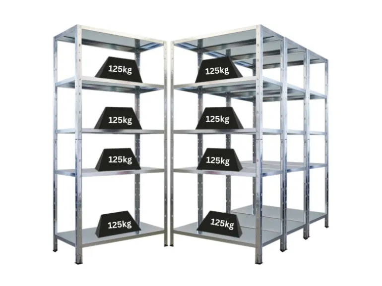 Die 5 Fachböden aus verzinktem Metall sind im 9,5 cm Raster individuell höhenverstellbar und tragen jeweils bis zu 125 kg. Jeder Boden ist zusätzlich mit einem Mittelträger verstärkt, damit auch schwere Lasten zuverlässig und sicher verstaut werden können.