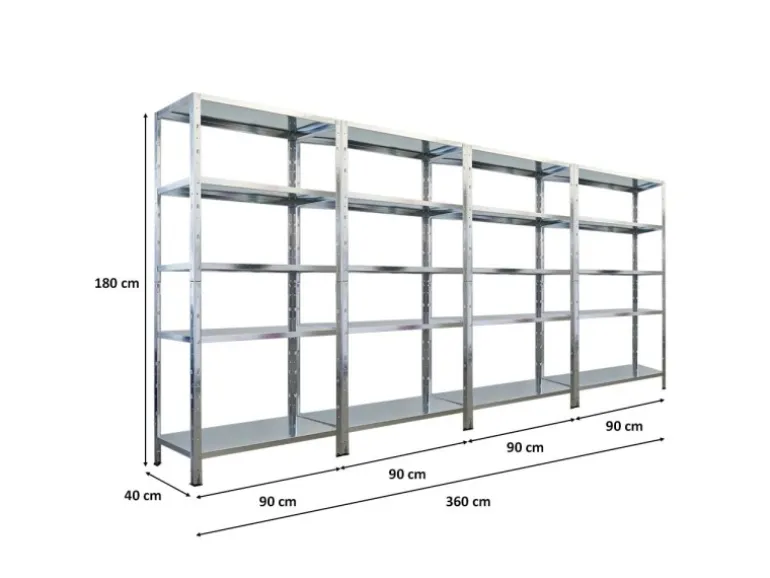 Das Schwerlastregal ist 180 cm hoch, 90 cm breit und 40 cm tief. Die Farbe ist Verzinkt