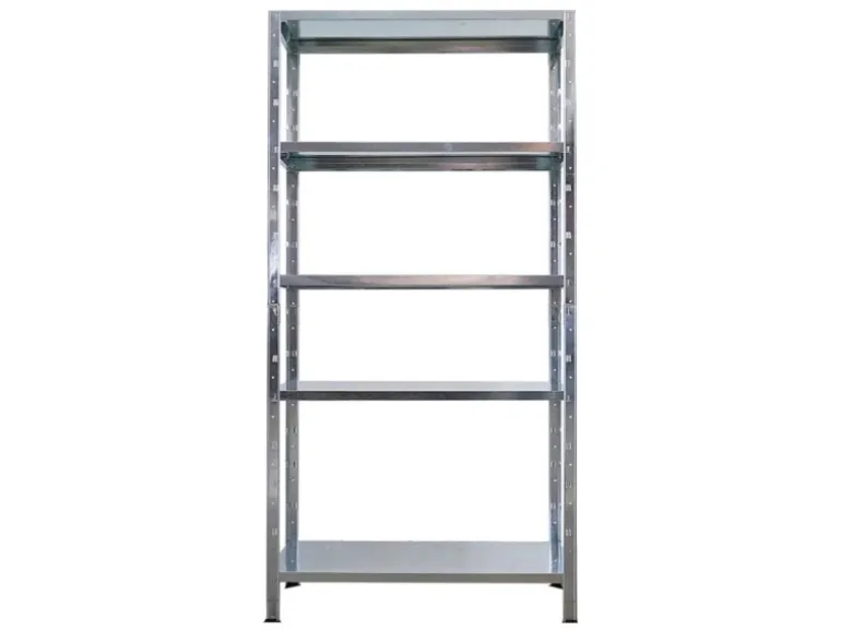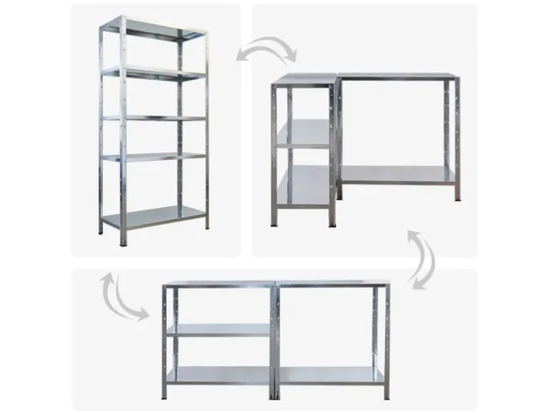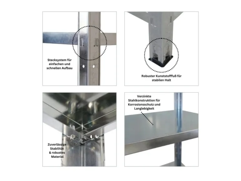 Die verzinkte Stahlkonstruktion schützt zuverlässig vor Korrosion, ist besonders pflegeleicht und robust. Kein Risiko von Schimmelbildung, ideal für Keller, Garage und andere feuchte Räume. Kunststofffüße am unteren Ende verhindern Kratzer auf deinem Boden und sorgen für einen sicheren Stand – auch bei voller Beladung.