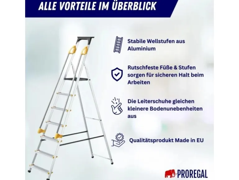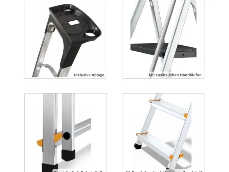 – Stabile Stufenstehleiter: Unsere robuste Stufenstehleiter Economy Basic aus strapazierfähigem Aluminium wurde speziell für den Einsatz im semi-professionellen Bereich entwickelt und kann auch gut in Pivathaushalten eingesetzt werden. Verlasse dich auf Stabilität und Langlebigkeit bei deinen alltäglichen Aufgaben.- Sichere Bügelleiter mit Werkzeugablage & Handlauf: Der 60cm Kopfbügel bietet nicht nur Sicherheit, sondern verfügt auch über einen praktischen Werkzeughalter. Darüber hinaus ist die Leiter mit beidseitigen Handläufen ausgestattet, die für zusätzliche Sicherheit sorgen. Komfortables Arbeiten ermöglicht.- Stahl-Arbeitsplattform für sicheres Arbeiten: Die 25x26cm Stahl-Arbeitsplattform mit pulverbeschichteter und speziell geprägter Oberfläche gewährleistet sicheres Arbeiten in verschiedenen Situationen.- Geriffelte Sprossen und rutschfeste Füße: Die geriffelten Sprossen, genietet und mit gelben Kunststoffabdeckungen gesichert, bieten einen stabilen Stand. Spezielle rutschfeste Füße schützen nicht nur den Boden, sondern gewährleisten auch höchste Sicherheitsstandards.- Zusätzliche Sicherheit für ausgewählte Modelle: Die Modelle mit 5, 6, 7 und 8 Stufen sind mit zusätzlichen Sicherungsgurten ausgestattet, die zusätzliche Unterstützung und Sicherheit bieten.- Beeindruckende Traglast und Qualitätszertifizierung: Mit einer maximalen Traglast von 150 kg eignet sich diese Leiter für anspruchsvolle semi-professionelle Aufgaben. Zudem ist sie gemäß EN 131 zertifiziert, was höchste Qualitäts- und Sicherheitsstandards erfüllt. Verlasse dich auf höchste Qualität für deine Projekte.- TÜV Rheinland Zertifizierung: Durch TÜV Rheinland zertifiziert, was zusätzlich die Qualität und Sicherheitsstandards bestätigt.Wir arbeiten mit führenden Premium-Herstellern von Leitern, Rollgerüsten sowie Sonderkonstruktionen zusammen und stehen mit unseren Qualitätsprodukten Made in Europe als Garant für höchste Arbeitssicherheit. Die Fertigung ist nach ISO 9001 zertifiiziert. Damit Du lange Freude und maximale Sicherheit beim Verwenden der Produkte hast, ist eine langjährige Ersatzteilverfügbarkeit abgerundet durch ein umfangreiches Zubehörprogramm gesichert.