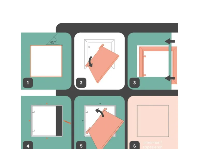 Für die Montage muss zuerst eine Öffnung in die Gipskartonplatte geschnitten werden. Danach ist der Rahmen an die Gipskartonplatte anzuschrauben. Im weiteren Schritt werden die Fuge zwischen Rahmen und Gipskartonplatte sowie die Schrauben verspachtelt. Zuletzt wird die Klappe in den Rahmen eingebaut.