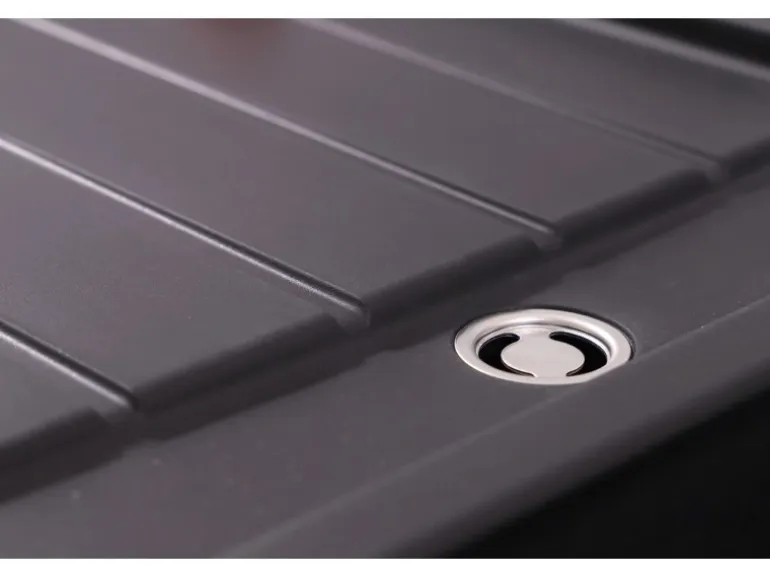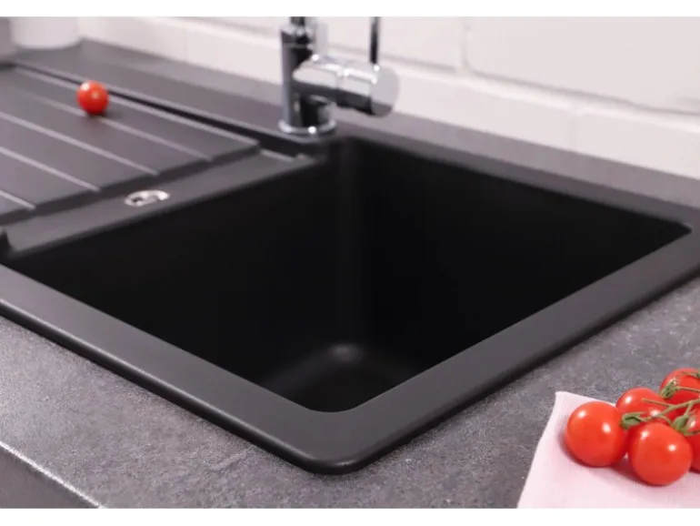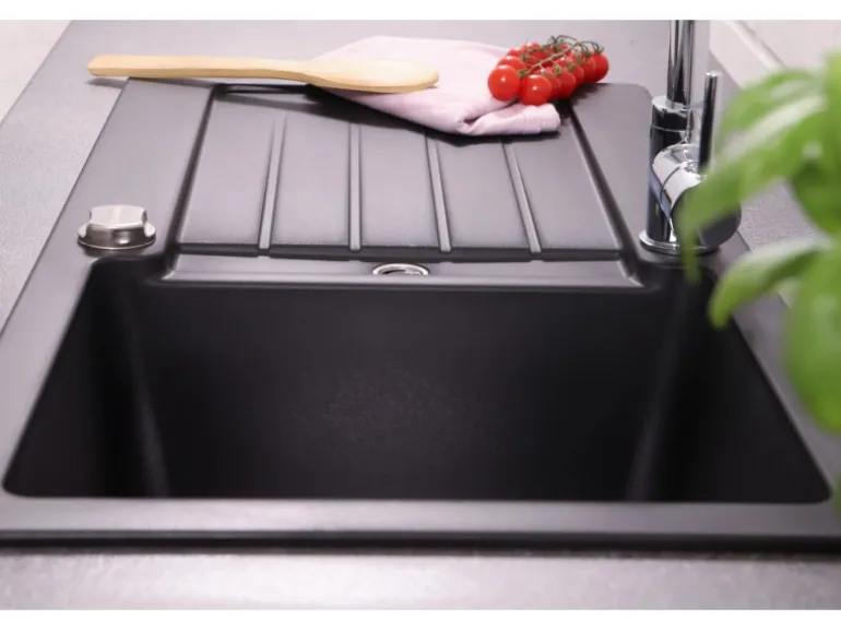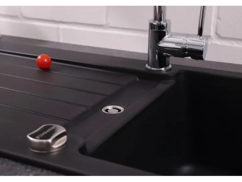 Entwickelt für Spülenunterschränke ab 45 cm Breite, kann die Spüle sowohl rechts als auch links eingebaut werden. Die Installation wird durch Fixierklemmen erleichtert, die für Arbeitsplatten mit Stärken von 2,8 cm und 3,8 cm geeignet sind.