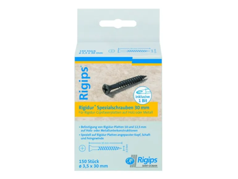 Die Rigidur Spezialschraube von Rigips dient zur Befestigung von Rigidur-Gipsfaserplatten auf Metallunterkonstruktionen bis 0,7 mm Dicke bzw. auf Holzunterkonstruktionen.