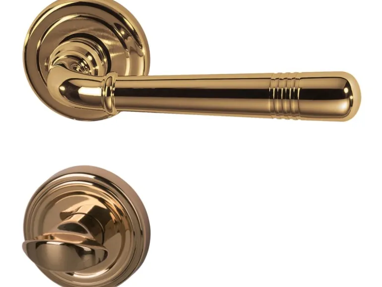 Rosettengarnitur „Sale-R“ in Messing Poliert für WC- und Badezimmertüren. Die Garnitur verfügt über eine Rückholfeder und garantiert somit einen dauerhaft waagrechten Sitz des Drückers. Die Garnitur ist passend für alle gängigen Türen mit einer Türstärke von 37 – 42 mm.