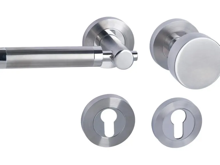 Rosettengarnitur „Montana-R“ mit Profilzylinderlochung in Edelstahl Poliert-Satiniert für Wohnungseingangstüren. Die Garnitur verfügt über eine Rückholfeder und garantiert somit einen dauerhaft waagrechten Sitz des Drückers. Die Garnitur ist passend für alle gängigen Türen mit einer Türstärke von 37 mm – 42 mm.
