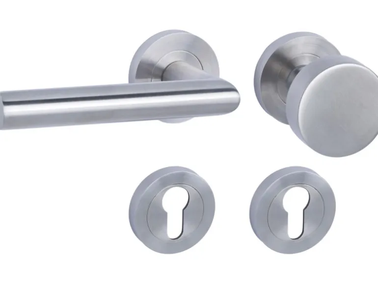 Rosettengarnitur „Montreal-R“ mit Profilzylinderlochung in Edelstahl Satiniert für Wohnungseingangstüren. Die Garnitur verfügt über eine Rückholfeder und garantiert somit einen dauerhaft waagrechten Sitz des Drückers. Die Garnitur ist passend für alle gängigen Türen mit einer Türstärke von 37 mm – 42 mm.