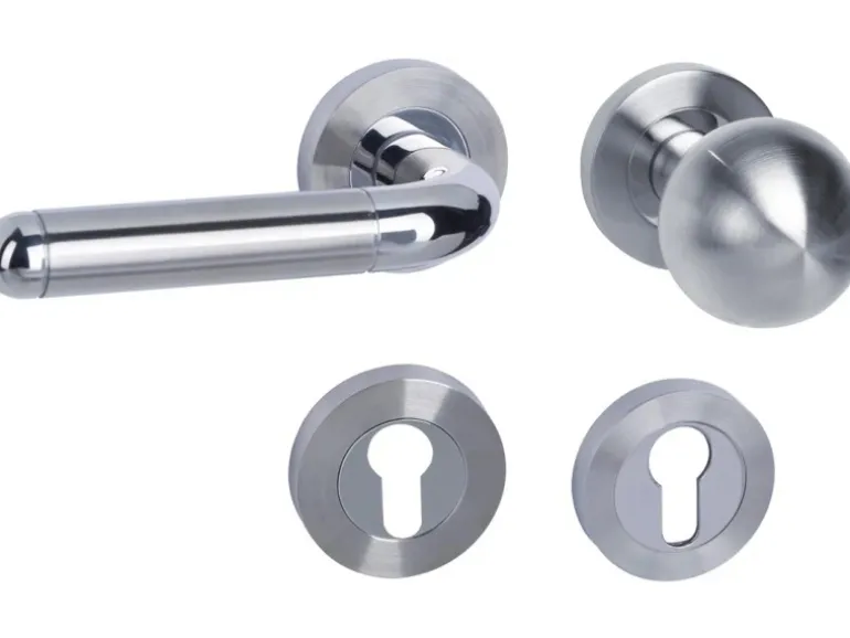 Rosettengarnitur „New York-R“ mit Profilzylinderlochung in Edelstahl Poliert-Satiniert für Wohnungseingangstüren. Die Garnitur verfügt über eine Rückholfeder und garantiert somit einen dauerhaft waagrechten Sitz des Drückers. Die Garnitur ist passend für alle gängigen Türen mit einer Türstärke von 37 mm – 42 mm.