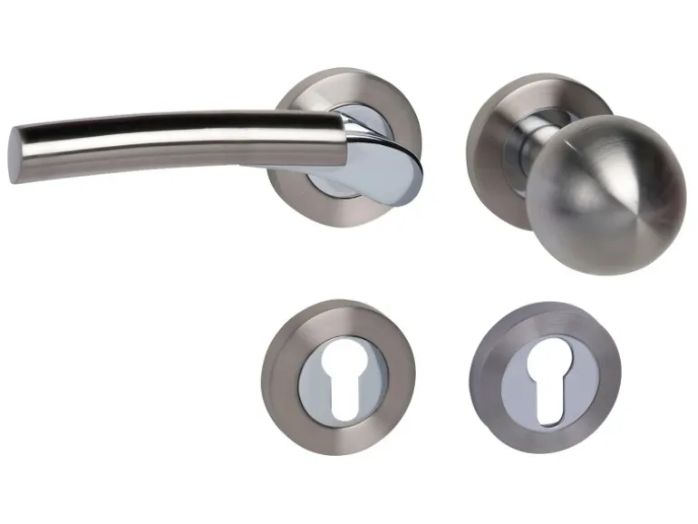 Rosettengarnitur „Südpol II-R“ mit Profilzylinderlochung in Chrom-Edelstahl Satiniert für Wohnungseingangstüren. Die Garnitur verfügt über eine Rückholfeder und garantiert somit einen dauerhaft waagrechten Sitz des Drückers. Die Garnitur ist passend für alle gängigen Türen mit einer Türstärke von 37 mm – 42 mm.