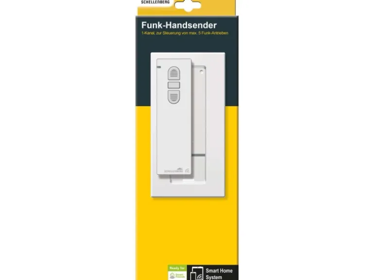Optional ist es möglich, den Funk-Handsender in die Smart Home Systeme von Smart Friends oder Schellenberg einzubinden. Der Handsender dient dann als ein zusätzliches Funk-Bedienelement, wenn Smartphone oder Tablet zur Steuerung nicht griffbereit sind. Möchten Sie mehrere Schellenberg Funk-Produkte nicht nur gruppiert, sondern auch unabhängig voneinander bedienen, empfehlen wir die Verwendung des Schellenberg Funk-Handsenders mit 5-Kanälen.